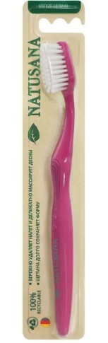 Natusana soft зубная щеткаЗубная щетка NATUSANA (Натусана) имеет мягкие закругленные щетинки из высококачественного материала и долго сохраняет форму своей чистящей поверхности. Бережно очищает зубы от бактериального налета и деликатно массирует десны, не травмируя их. Эргономичная ручка зубной щетки позволяет регулировать давление щетины на зубы и десны во время чистки. Ручка сделана из перерабатываемого пластика.