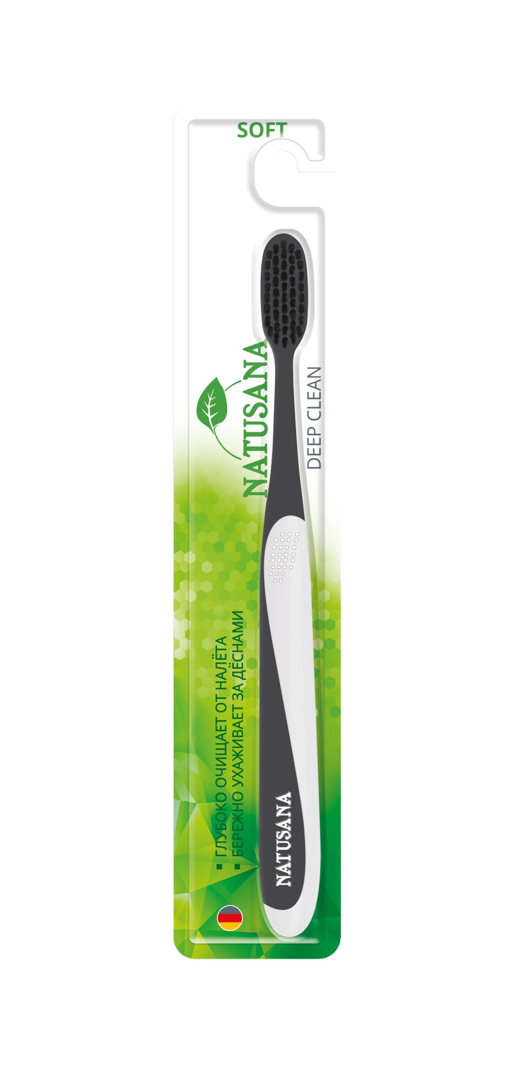 Natusana deep clean soft зубная щеткаЗубная щетка NATUSANA Deep Clean Medium полирует зубную эмаль и удаляет окрашенный налёт. Густые филированные щетинки обеспечивают качественную гигиену полости рта в труднодоступных местах и предупреждают образование зубного камня, а также безболезненно массируют дёсны и поддерживают их тонус. Утончённая на кончиках щетина способствует оптимальному вспениванию и распределению зубной пасты в полости рта. Эргономичная ручка зубной щётки с резиновой вставкой и удобным упором для большого пальца позволяет регулировать давление щетинок на зубы и дёсны во время чистки.