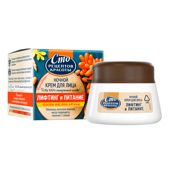 100 Рецептов красоты лифтинг и питание крем ночной банка 50 млВ 22:00 встречай сон красоты с полезным ночным кремом! Встречай каждую ночь с полезным ночным кремом Сто Рецептов Красоты! Ночной крем для лица Лифтинг и питание с маслом облепихи и первоцветом обеспечивает необходимый уход за возрастной кожей и полноценное питание, необходимое для восстановления кожи, пока ты спишь! Облепиха - важный компонент для антивозрастного ухода, восстановления и защиты кожи от сухости, благодаря содержанию рекордного количества полезных веществ (более 100!). Масло облепихи улучшает обмен веществ и микроциркуляцию в подкожно-жировой клетчатке, способствуя питанию, смягчению кожи, предохраняет кожу от высыхания и шелушения; восстанавливает липидный и кислотно-щелочной баланс кожи, способствует повышению упругости и эластичности кожи, устранению возрастных и мимических морщин за счет стимуляции синтеза коллагена), предотвращает преждевременное старение кожи. Так же способствует отбеливанию кожи, осветлению веснушек и других пигментных пятен, восстанавливает кожу, поврежденную вследствие солнечных или химических ожогов, предупреждает воспаление кожи и способствует устранению угревой сыпи. Пчелиное маточное молочко считается супер-продуктом из-за феноменально высокого содержания биологически активных веществ, омолаживающих кожу. Масло Виноградных косточек и молочко 5 злаков питают и смягчают кожу, поддерживая ее естественную красоту. Помимо этого, масло виноградных косточек успокаивает, питает, смягчает, увлажняет, тонизирует кожу, делает ее более упругой, укрепляет стенки кожных сосудов, улучшает цвет лица, противостоит разрушению волокон коллагена и эластина, защищает от вредного солнечного излучения. Благодаря высокому содержанию особых биофлавоноидов, напоминающих структуру человеческого эстрогена (которых называют фитоэстрогенами) масло восстанавливает поврежденные мембраны клеток, так же оказывает антиоксидантное, регенерирующее и, соответственно, выраженное антивозрастное действие. Кроме этого, масло обеспечивает регулирует деятельность сальных желез.