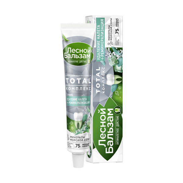 Лесной бальзам зубная паста комплекс двойная мята на отваре трав 75 млПопробуй новую зубную пасту Лесной бальзам Комплекс с морской солью, маслом мяты, отваром трав и кальцием. Формула зубной пасты на 95% состоит из ингредиентов натурального происхождения, интенсивно очищает зубы от налета, защищает от зубного камня и укрепляет эмаль, обеспечивая комплексную защиту всей полости рта.Формула зубной пасты Комплекс обеспечивает усиленное очищение1 и борется с первопричиной развития серьезных проблем полости рта – зубным налетом! Зубной налет вызывает кариес, влияет на изменение цвета зубов, приводит к образованию зубного камня и кровоточивости десен. Зубная паста Лесной бальзам Комплекс содержит на 50% больше очищающих частиц1, эффективно удаляет налет даже в межзубных промежутках, защищает от образования зубного камня и проблем с деснами.Клинически доказано: до 95% меньше налета!2Формула зубной пасты усилена минеральными компонентами: морская соль защищает от бактерий и помогает предотвратить разрушающее действие налета на эмаль зубов, а кальций восстанавливает зубную эмаль.Отвар трав и масло мяты оказывают противовоспалительное и укрепляющее действие на десны