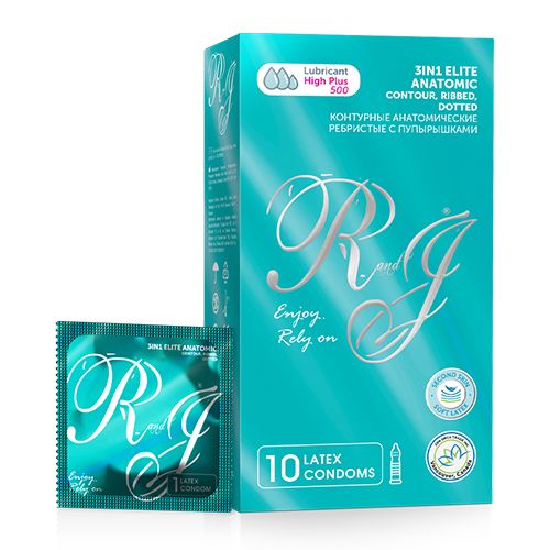 Romeo and Juliette eite презервативы контурные анатомические ребристые с пупырышками нат латекс 10 штПрезервативы из натурального латекса R and J 3in1 Elite Anatomic - Контурные Анатомические Ребристые с Пупырышками. 10 штук в упаковке. Смазка 500 mg. При производстве презервативов "R and J" используется технология "Thin Technology". Эта технология позволяет получать чувственные ощущения во время секса. Используется более мягкий латекс. При надевании нужно, аккуратно придерживая уплотняющее кольцо, мягко и не спеша, аккуратненько надеть презерватив